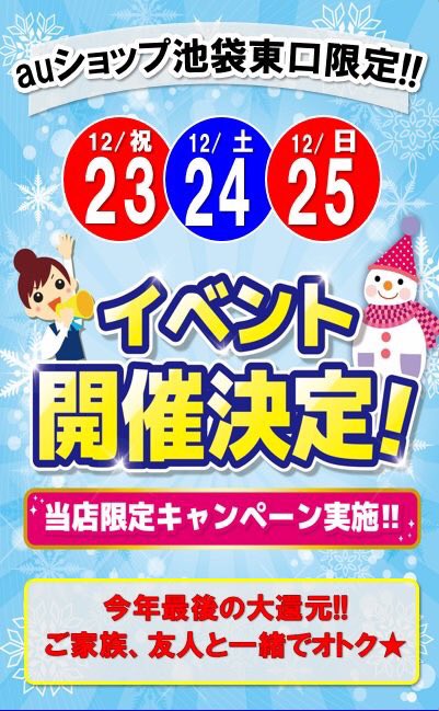 今週末のauショップ案件ですが、こちらのauショップもクリスマス・イベントでMNP還元増額のようです。