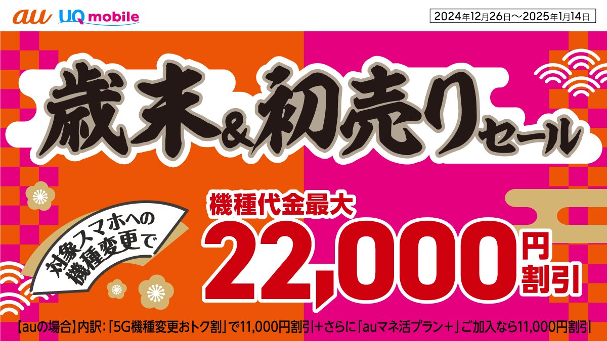 12/26~1/14の期間中、スマホ機種変更がおトク! 対象のスマホへの機種変更で機種代金最大22,000円割引! ※対象の料金プラン、故障紛失サポート(有料)への加入が必要